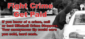 A minimum of $250 is paid for rewards on all “Crime of the Weeks” solved through Crime Stoppers. Mitchell Area Crime Stoppers, Inc offers this reward. Rewards will not be paid if crime tips, leading to an arrest, are not made directly to Mitchell Area Crime Stoppers, Inc. by telephone or by web tip.